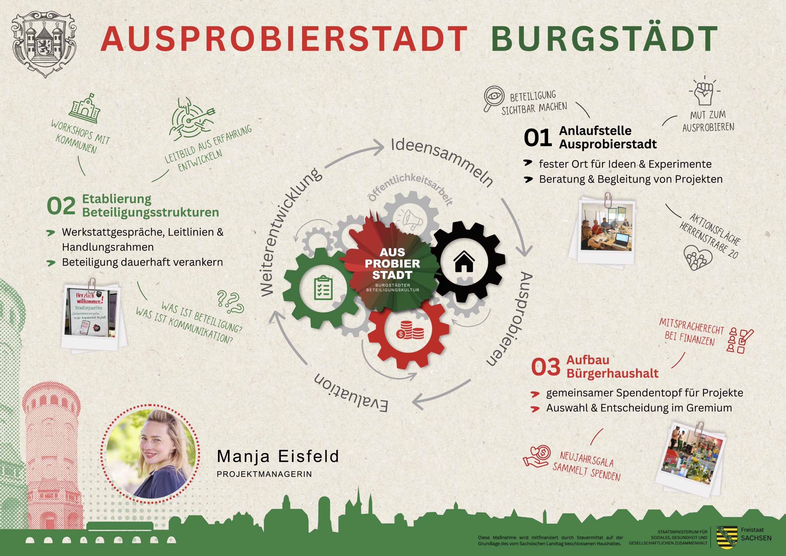 Federführung: Hauptamt Burgstädt (0,25 Stelle – SB Jugend & Beteiligung/Digitalisierung; Kompetenzaufbau, Jugendstadtrat) mit Bürgermeister, Kämmerei, Bauamt, Öffentlichkeitsarbeit. Externe Projektleitung/Coach: Manja Eisfeld (Maikirschen). Partner: Stadtrat (u.a. Bürgerbudget-Satzung), Schulen, Gewerbeverein/Unternehmen, WBG Burgstädt eG, Vereine, Privatpersonen (Projektanträge/Umsetzung).